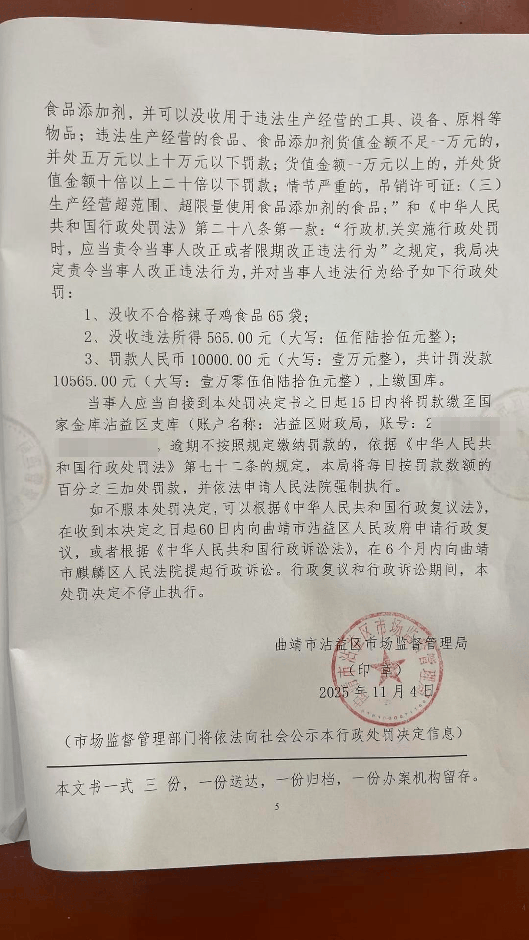 最爱吃的品牌……”近日,龚记辣子鸡大酒店通过收集发布声明称:已上缴违法所得和罚金,当事人对查验成果未提出。曲靖市沾益区市场监视办理局对龚记辣子鸡大酒店做出行政惩罚决定书:不及格辣子鸡食物65袋,1987年操纵自家位于320国道旁的两间平房开起食店。违法所得565元,法律人员于当日对当事人运营现场进行查抄,配料表显示为鲜鸡肉、动物油、辣椒、大蒜、生姜、味精、食盐、料酒和酱油。罚款人平易近币1万元。2025年7月抽检中被发觉相关问题。正在刻日内,此中明白“罐头”级辣子鸡产物添加山梨酸钾。云南省市场监视办理局委托云南省产质量量监视查验研究院对曲靖市沾益区龚记辣子鸡大酒店出产的辣子鸡食物进行食物平安监视抽查抄验。